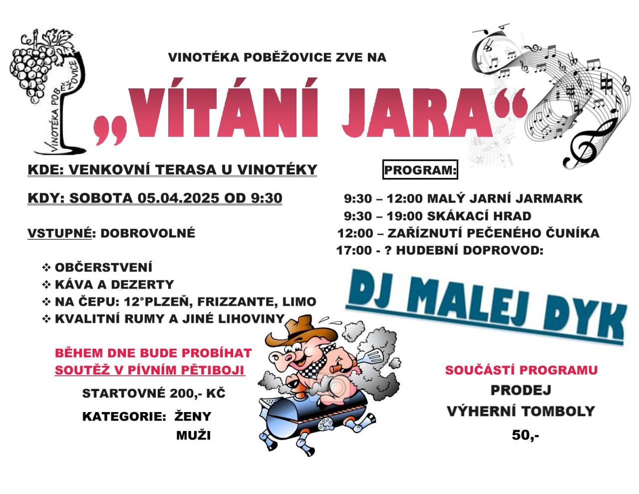 Vinotéka a rychlé občerstvení Poběžovice Vás zve na tradiční Vítání jara v sobotu 5.4.2025 od 9:30 hodin. Bude připraven bohatý program pro děti ale i dospělé. Těšit se můžete na jarní jarmark, opečené prasátko a různé dobroty z domácí kuchyně Vinotéky. Nebude chybět soutěž v pivním pětiboji.