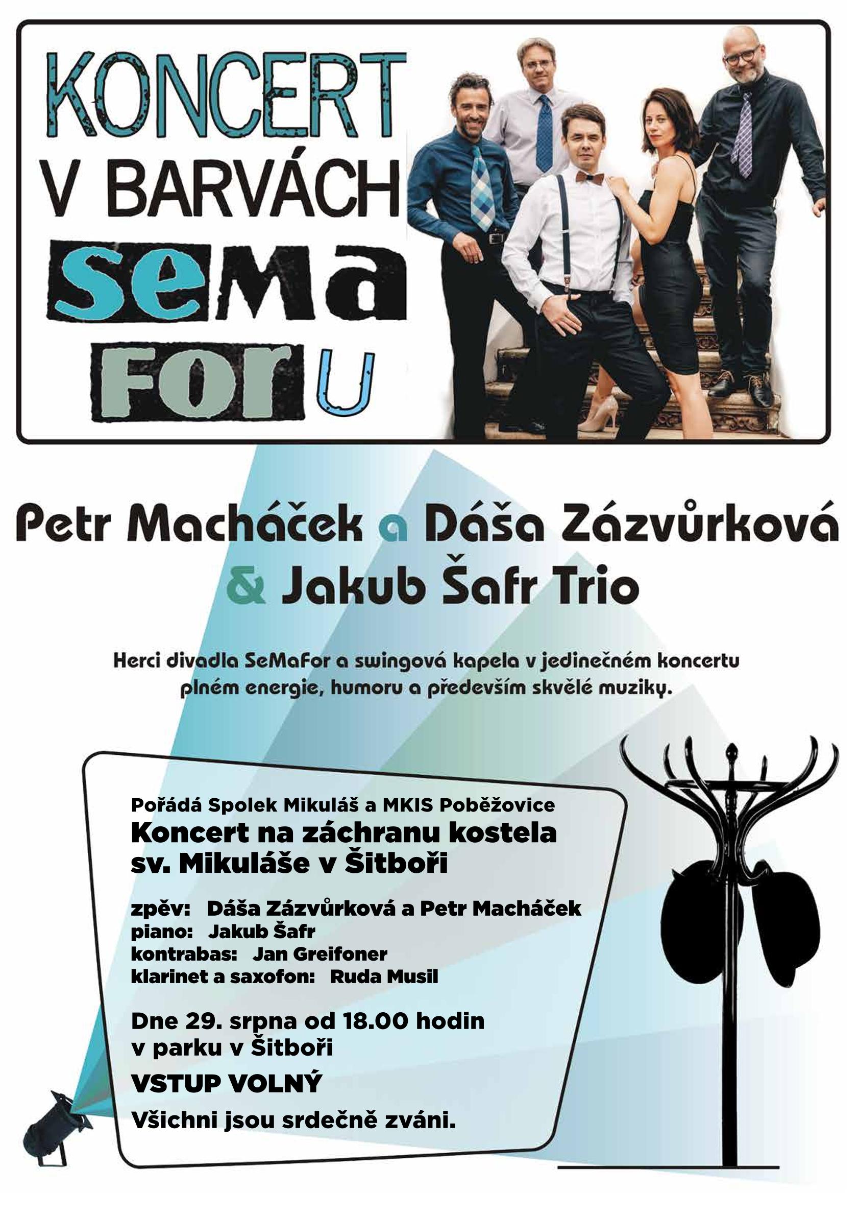 Spolek Mikuláš a MKIS Poběžovice Vás zve na letní koncert "Písničky Semaforu" v podání herců divadla SeMaFor a swingové kapely s Dášou Zázvůrkovou. Přijďte si užít jedinečný koncert plný energie, humoru a především skvělou muziku. Těšíme se na Vás.