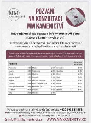 V pondělí 16. 2. ve 11:20 bude na městském hřbitově v Poběžovicích nabízet kamenické práce MM kamenictvi s.r.o., Nasavrky.