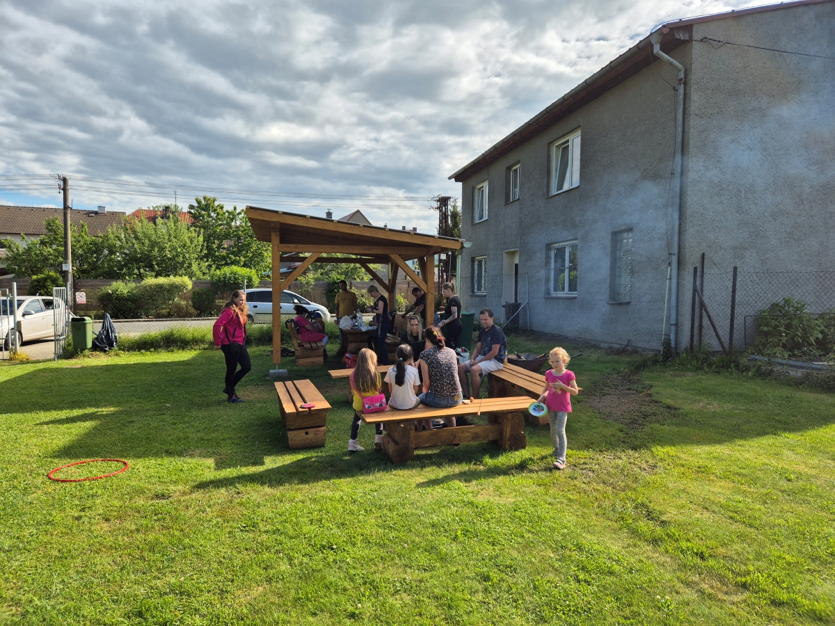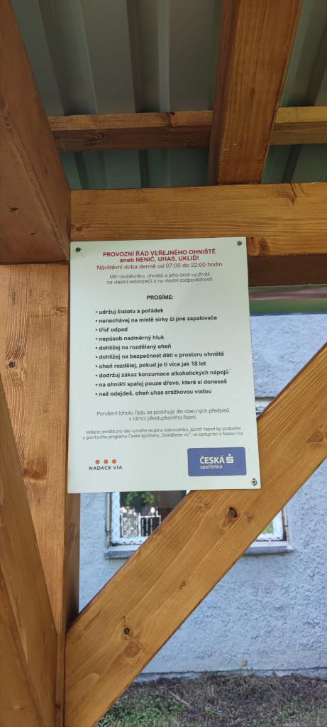 V neděli 26. 5. v podvečer se uskutečnilo historicky první veřejné opékání u posezení na školním hřišti. Zúčastnily se téměř dvě desítky místních obyvatel. Společně poseděli, upekli si špekáčky a zhodnotili projekt. Vyvstal zde nápad, že by mohlo probíhat pravidelné organizované veřejné opékání. Pomohlo by to překonat počáteční nesmělost místních k svévolnému užívání posezení. Využití je řízeno provozním řádem umístěným v pergole. Není nutné se předem někde registrovat. Využití je zcela zdarma. Za vznik posezení patří díky partě místních obyvatel, kteří obětovali volný čas a po práci posezení vybudovali. Další velký dík patří městu Poběžovice spolu s technickými službami za pomoc s realizací a finanční spoluúčastí. Celý projekt byl podpořen z grantové podpory programu České spořitelny „Dokážeme víc“, ve spolupráci s Nadací Via.